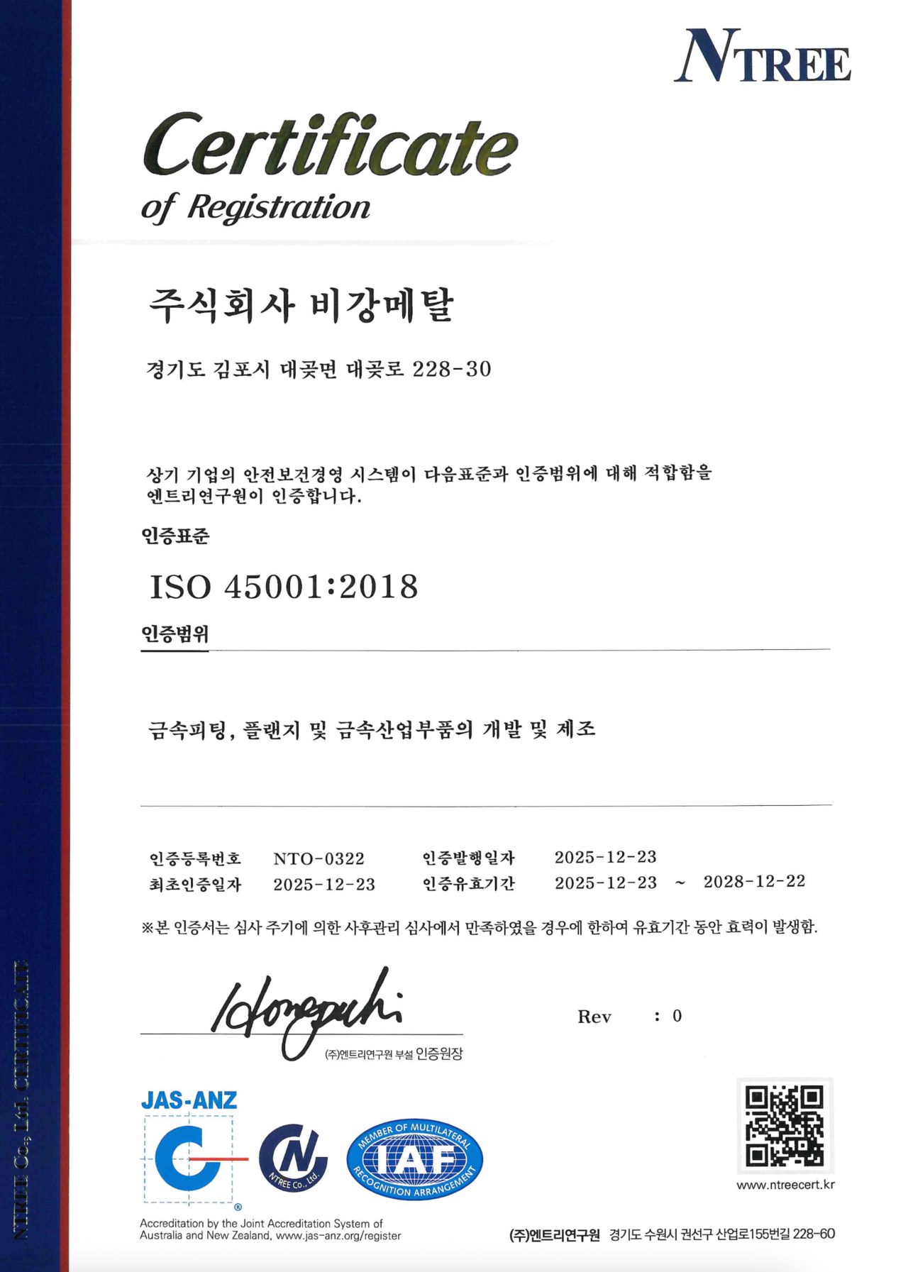 (주)비강메탈 대표이사 유형성입니다.